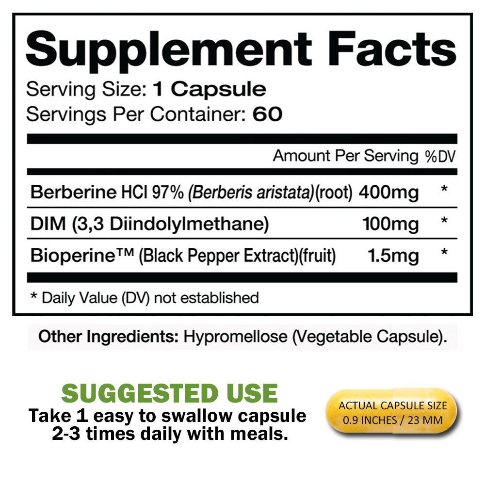 Dimberine™ is a unique blend of premium natural ingredients containing Diindolylmethane (DIM), Berberine HCl, and BioPerine. This powerful combination was carefully designed to support healthy blood glucose, fat metabolism and overall wellness.